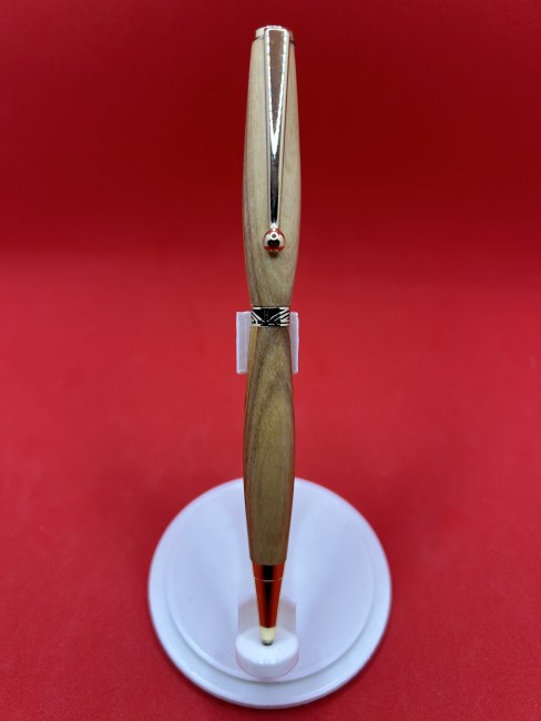 Magnifique stylo en bois à bille, fabriqué en bois d'olivier de Bethléem. Le mécanisme est quart tournant avec encre noire.