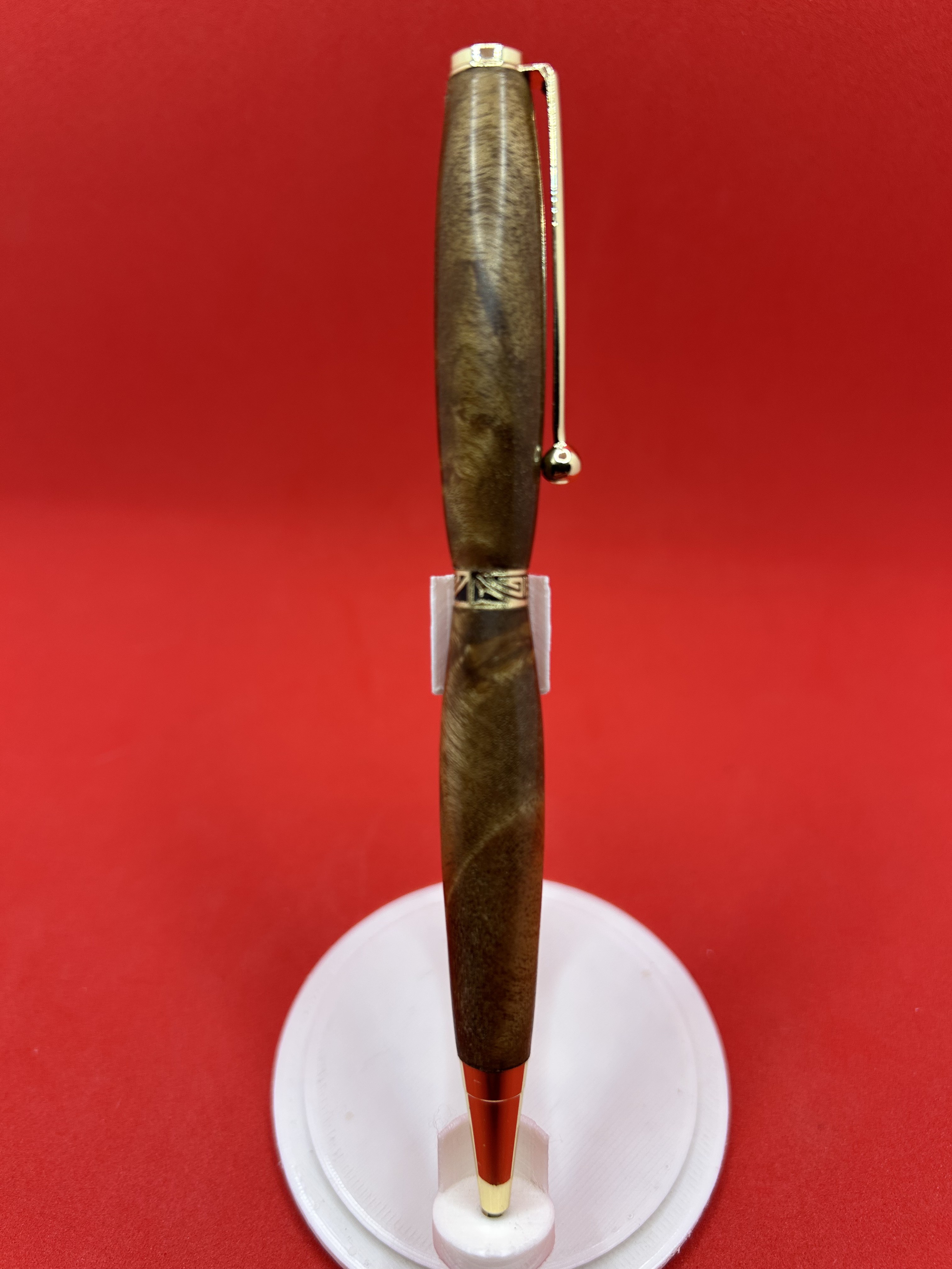 Stylo en bois de loupe de noyer, mécanisme quart tournant et encre noire.