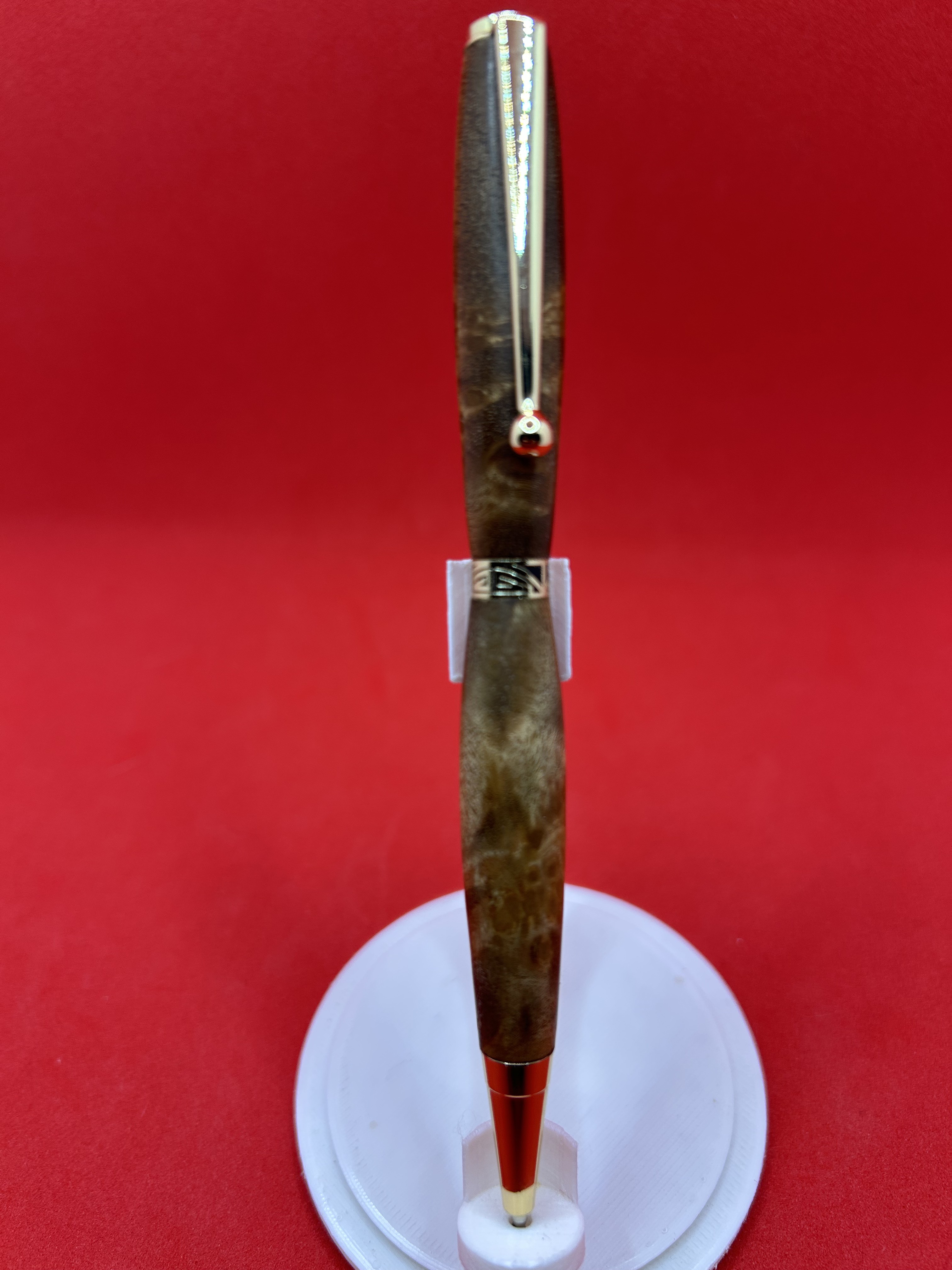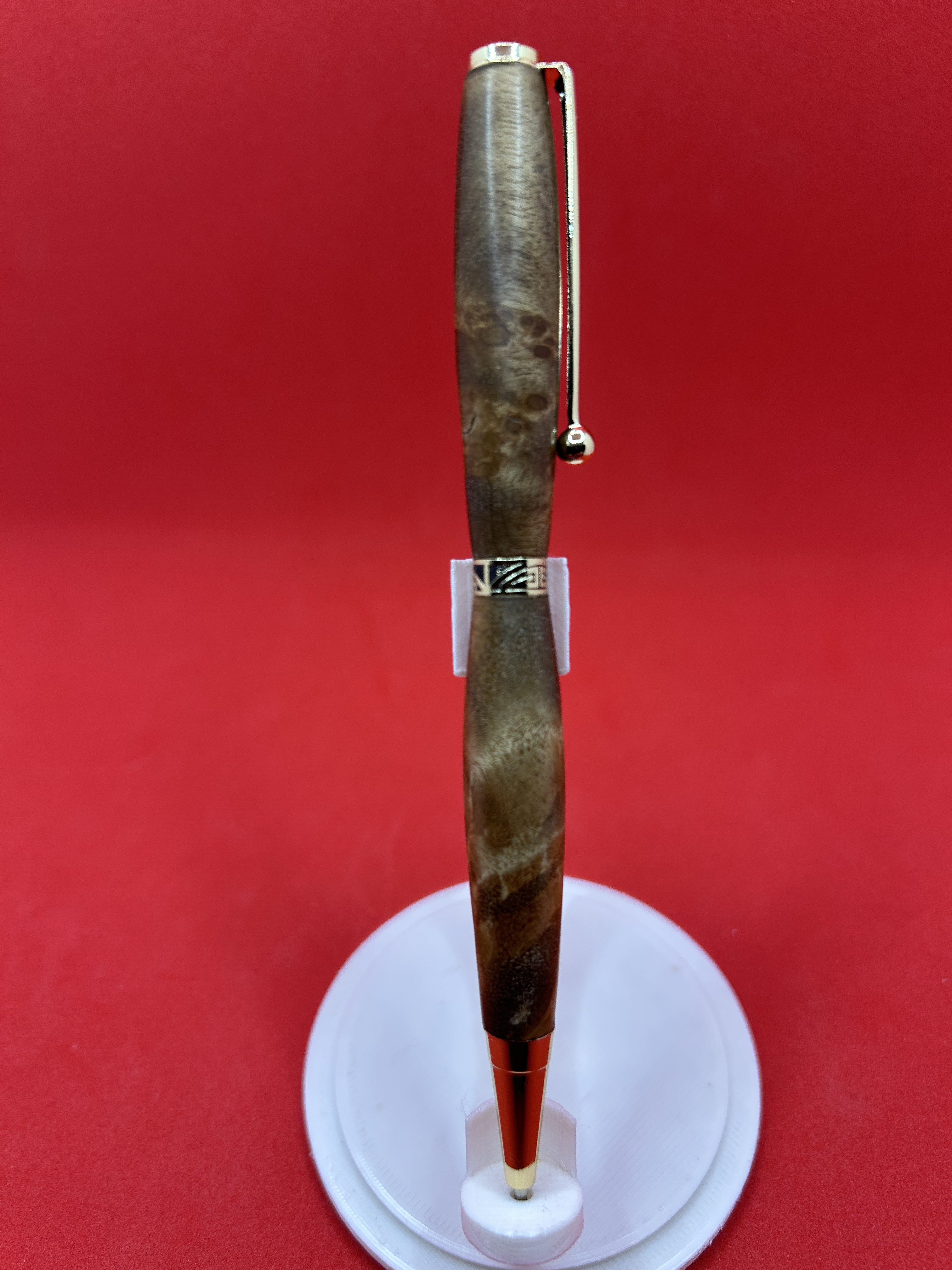 Stylo en bois de loupe de noyer, mécanisme quart tournant et encre noire.